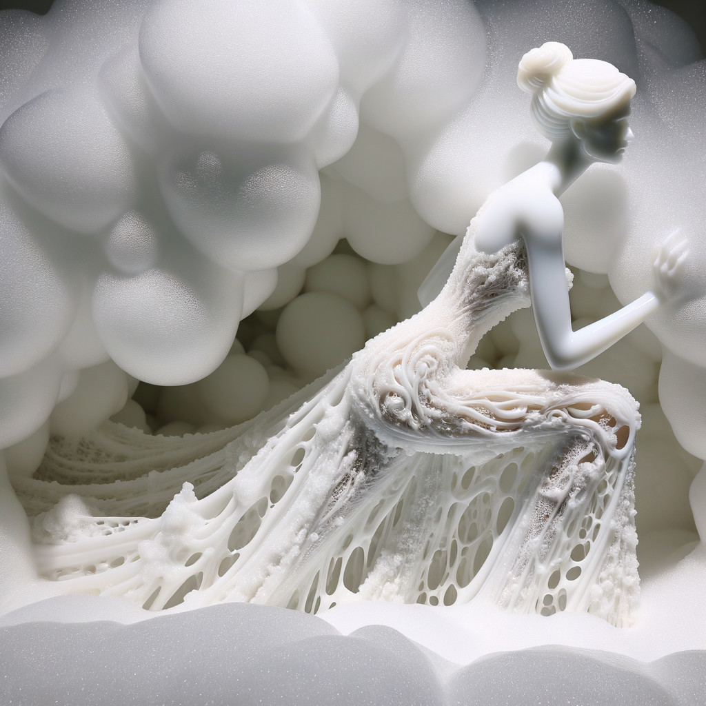 A serene figure in a flowing, shimmering gown sits gracefully among soft, billowing clouds. The ethereal backdrop enhances a dreamlike quality, creating a tranquil, otherworldly atmosphere.