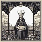 A regal figure with a crown of horns sits amidst serpents, cradling an ornate box. The intricate background features stylized dragons and elegant patterns, evoking a sense of mystery and power.