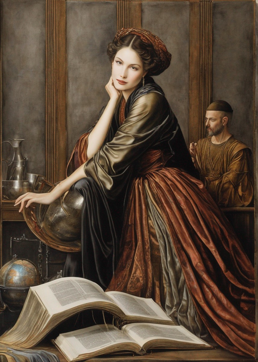 A portrait of a woman in renaissance attire with a gold hairpin, gazing directly at the viewer, against a grey background.