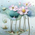 A serene landscape featuring large, colorful lotus flowers on towering stems, set against a soft blue background. Delicate figures are nestled among the flora, creating a mystical atmosphere.