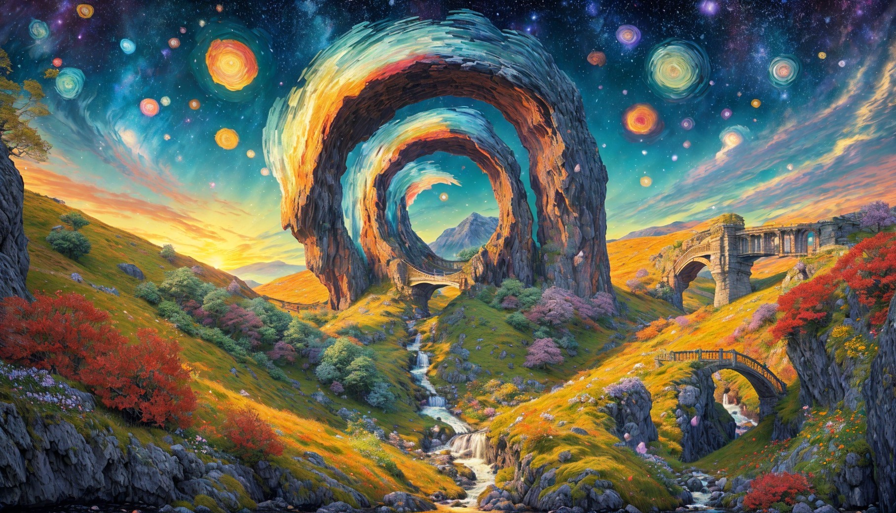 Prompt: highland landscape in mountains, rocky path and stream, red and purple glorious sunset, burning fire and red sun, Conquest of Paradise, cosmic sky, nice waterfalls and a beautiful tree and path, bridge over river, some flower details by Gustav Klimt , elegant fantasy, intricate beautiful wallpaper colourful, Van Gogh