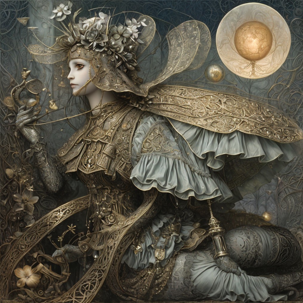 A surreal portrait features two otherworldly figures with striking features: one with elaborate horns and intricate attire, and the other with soft curls, set against a starry night and full moon.