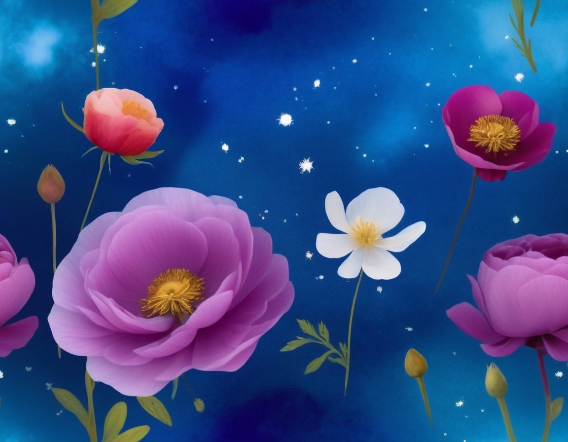 Prompt: Bunch of Ranunculus, roses, peonies, snowdrops, poppies of varying sizes; tissue paper collage and alcohol ink with overpainted metallic highlights; coherent, balanced components