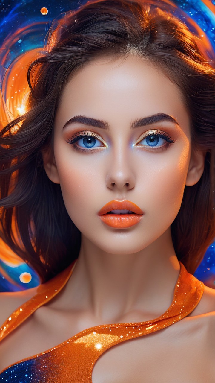A stunning portrait of a young woman with captivating blue eyes and vibrant orange lips, set against a cosmic background featuring planets and a starry universe. Her hair flows elegantly.