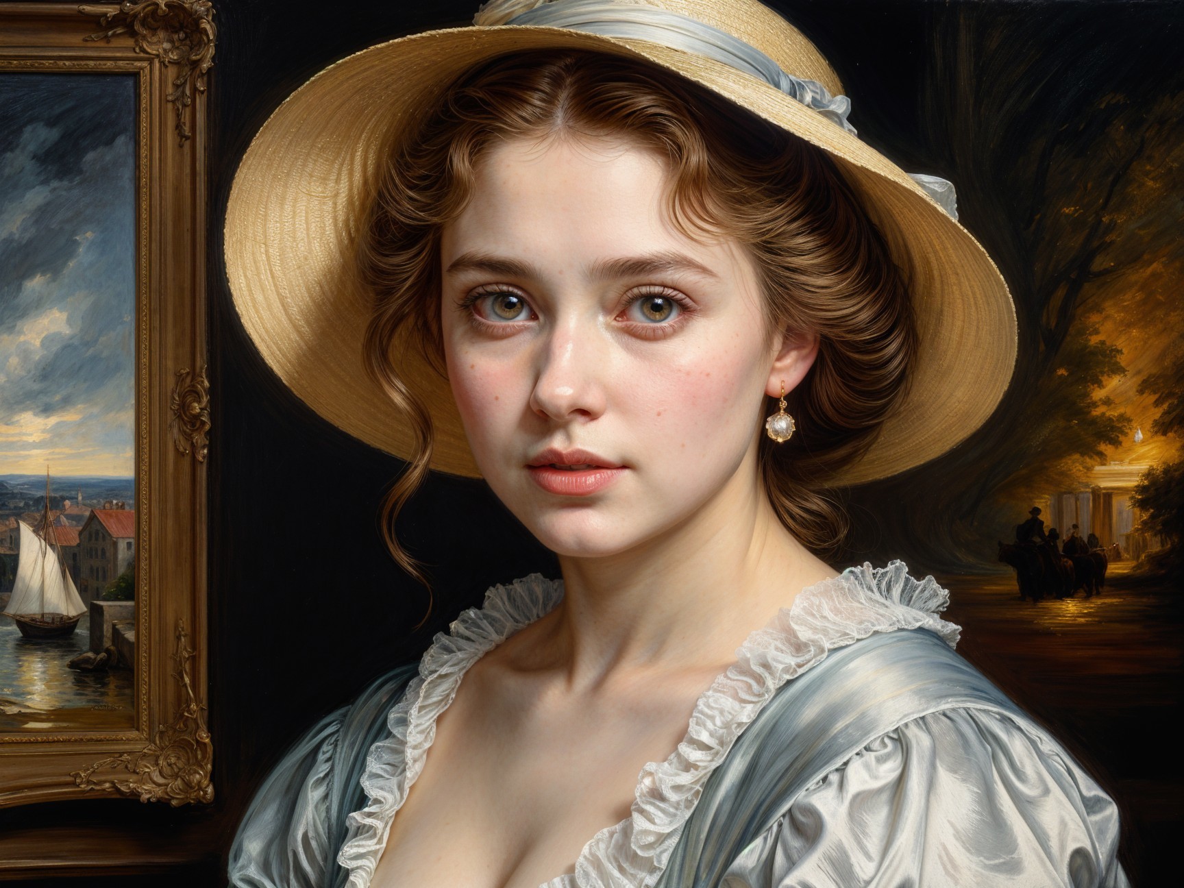 A young woman with soft features and a straw hat gazes thoughtfully. She wears a delicate blue dress with lace trim, set against a rich, classic interior with a painting and candlelit scene.