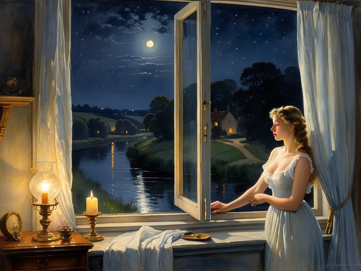 A woman gazes at the Avon River flowing below; she seems to hear a sweet serenade, a song of long ago.