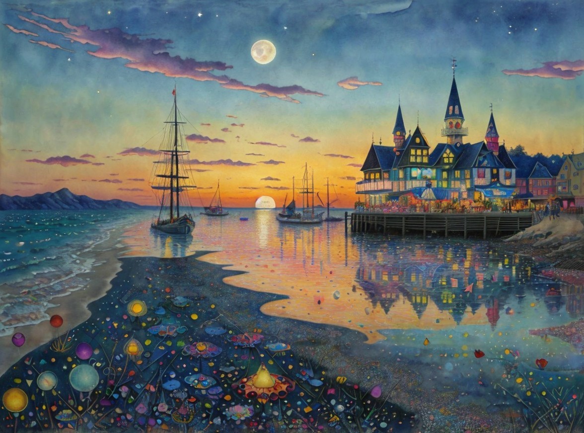Prompt: Go for a walk at the seaside, gorgeous amazing watercolor patchwork, only single moon, Kandinsky dot line drawing, highly detailed, exquisitely intricate, beautiful, clear, high quality, colorful, fullmoon, fantastic - Daniel Merriam, Iwona Lifsches, Alex Alemany,