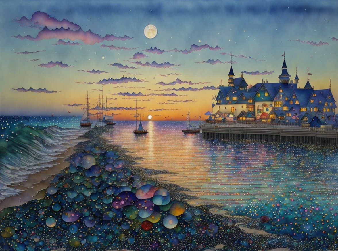 Go for a walk at the seaside, gorgeous amazing watercolor patchwork, only single moon, Kandinsky dot line drawing, highly detailed, exquisitely intricate, beautiful, clear, high quality, colorful, fullmoon, fantastic - Daniel Merriam, Iwona Lifsches, Alex Alemany,