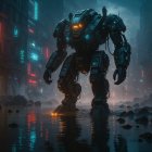 A towering battle mech stands amidst a futuristic cityscape, illuminated by neon lights. Mist rises from the waterlogged ground, creating a cyberpunk atmosphere filled with vivid colors and shadows.