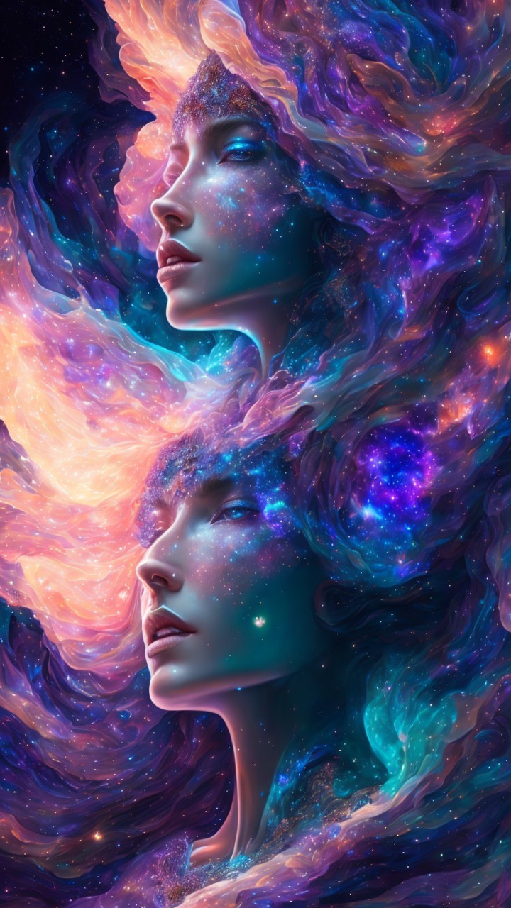 The image features a surreal, futuristic female face with floral and glowing network designs, set against a vibrant sunset landscape, evoking a blend of nature and technology.