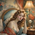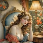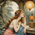 A serene, ethereal woman sits gracefully on a table, draped in flowing fabric. She gazes out at a lush landscape through an ornate window, illuminated by warm, glowing lanterns.