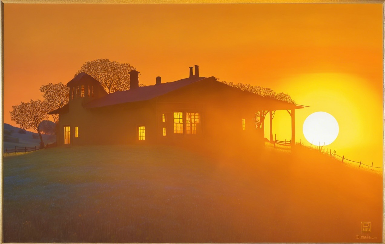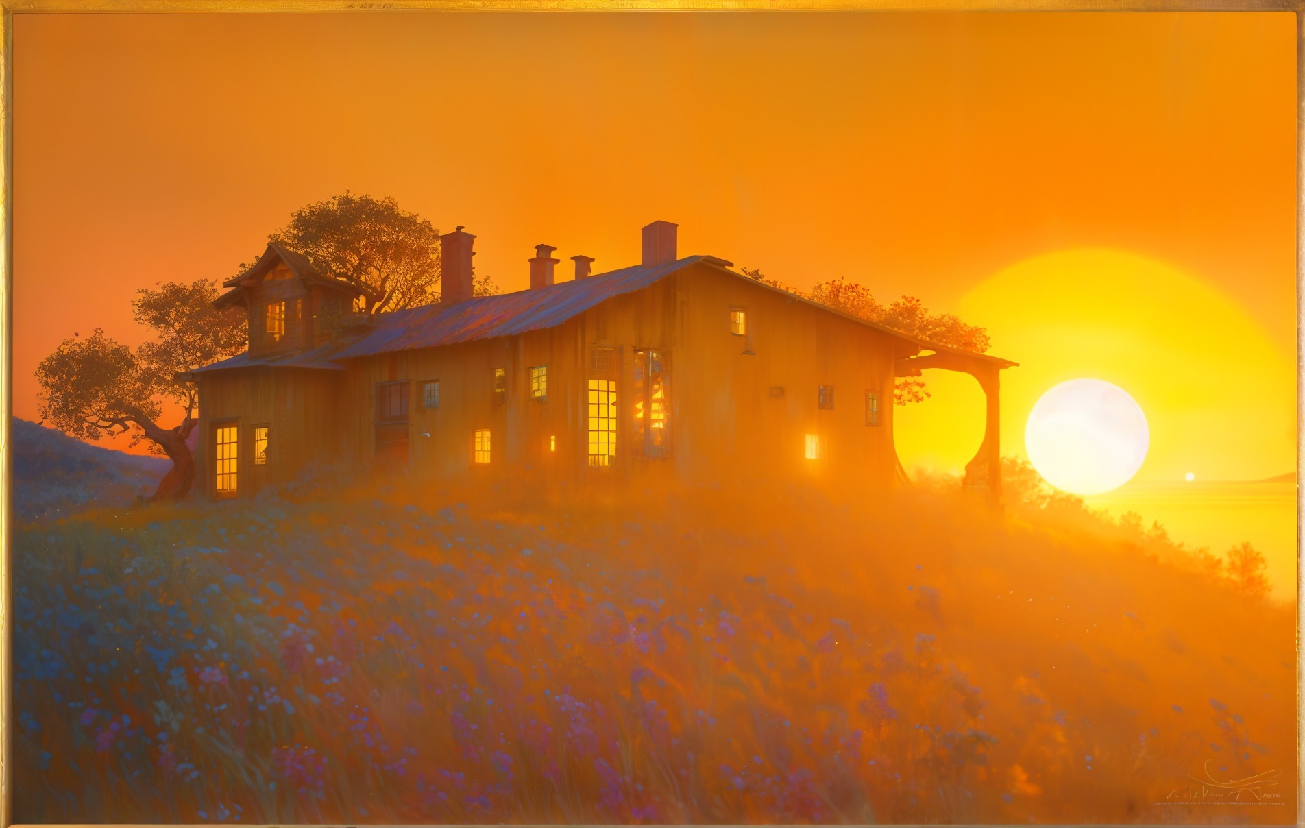 A charming yellow house sits amidst vibrant wildflowers, bathed in the warm glow of a sunset. Tall trees frame the scene, creating a peaceful and inviting atmosphere.