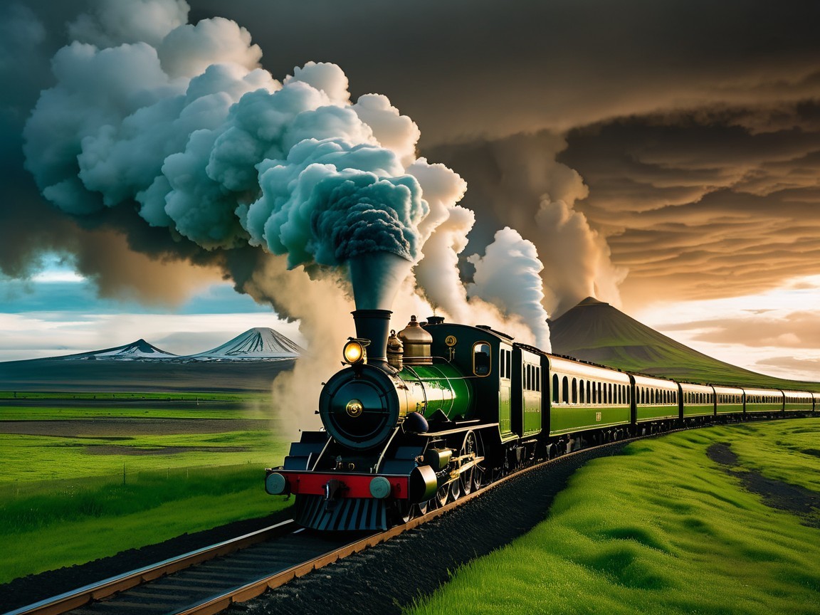 Prompt: A steampunk train travels through Iceland. Very green fields, a geyser, and an erupting volcano are visible in the distance. The sky is dark and turbulent, as if preceding a storm.