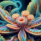 Floracrusta luminifera is a bioluminescent xenofloral organism native to the abyssal twilight biomes of exoplanetary coral forests, where atmosphere and ocean intermingle in a single dense medium. The organism’s sprawling architecture resembles both coral and cephalopod morphology—radiating arms of soft iridescent filaments converge around a central mouth-like calyx. Each arm undulates with fractal folds that act as both photosynthetic and sensory organs.