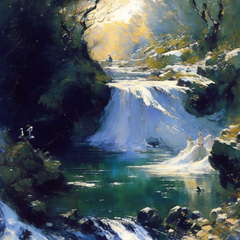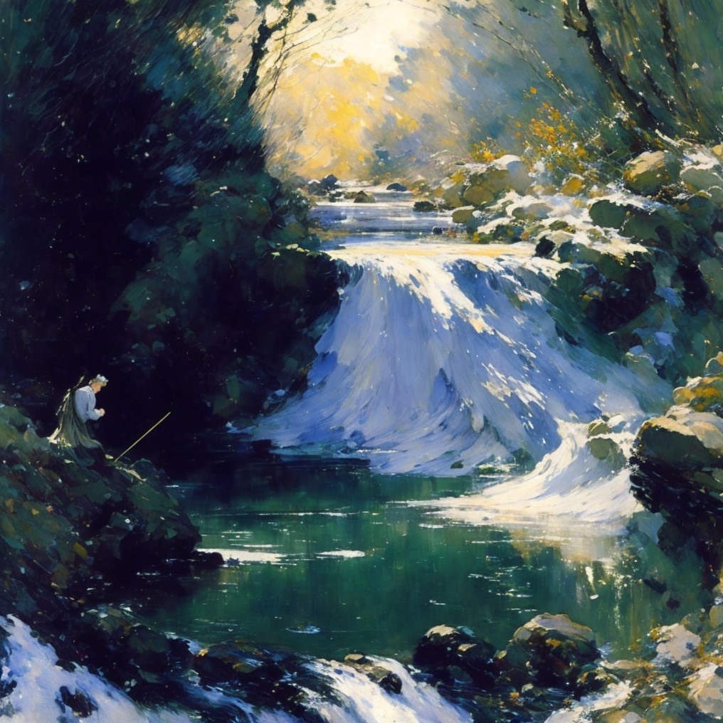 Tranquil painting of person fishing at serene waterfall