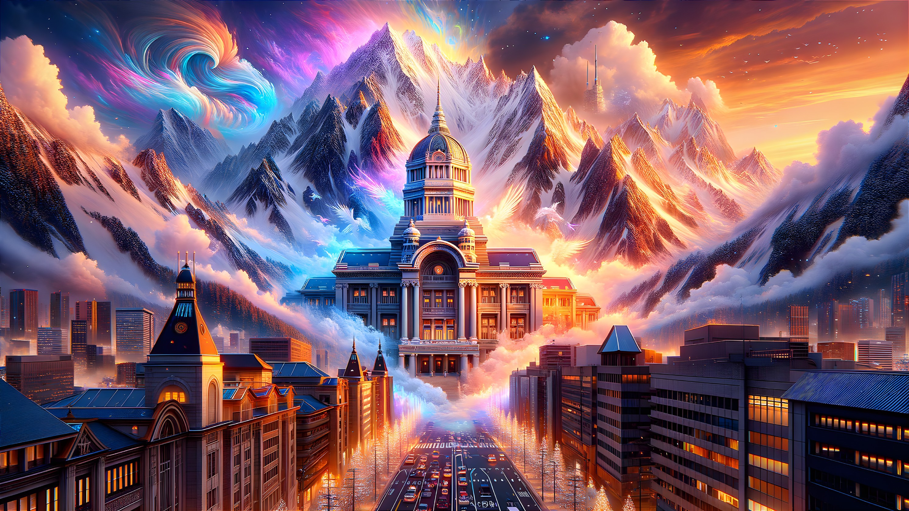 Explore a breathtaking digital artwork capturing a majestic snow-capped mountain with intricate details and surreal colors. The piece features a dreamlike atmosphere, ethereal mist, and vibrant hues, showcasing a blend of fantasy elements and architectural marvels. This masterpiece boasts hyperrealistic details, grandeur, and magical lighting, creating an enchanting and elegant visual experience in
