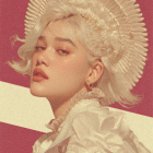 A young woman with sleek blonde hair styled in a bob and bangs poses, wearing a shiny pink bodysuit. She has striking makeup with bold lips, set against a vibrant pink background.