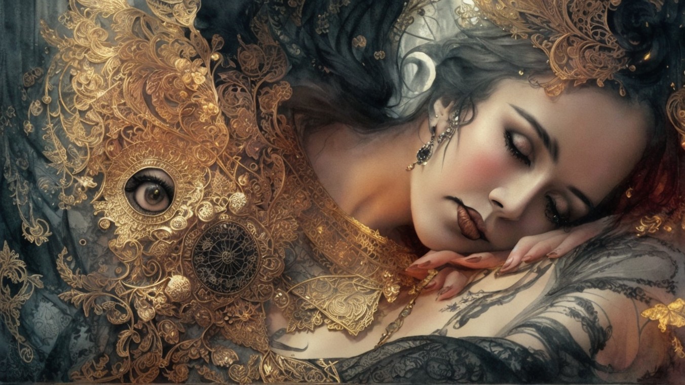 A mysterious woman adorned with intricate gold patterns and jewelry gazes thoughtfully, her dark hair flowing around her. An enchanting eye stares from the ornate design beside her.