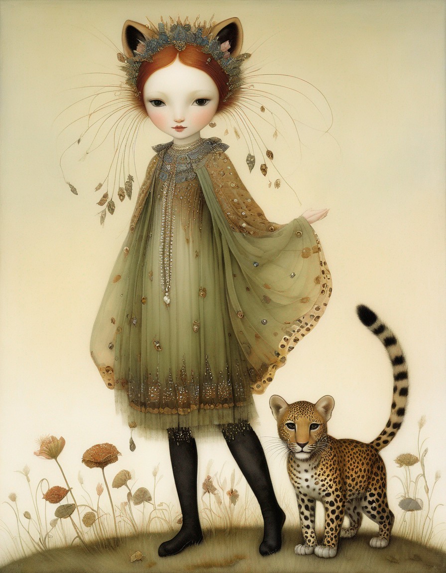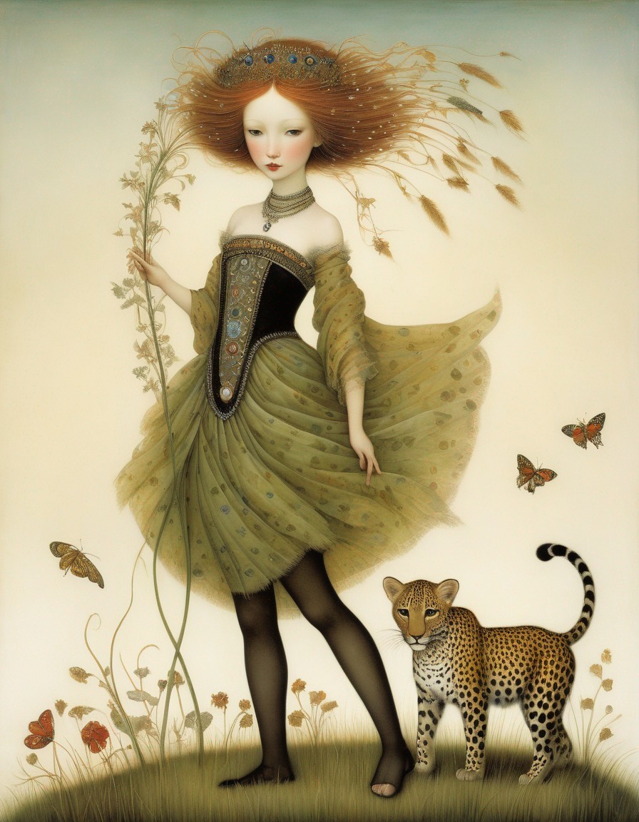 Whimsical painting of girl with halo in dandelion dress, butterflies, and leopards