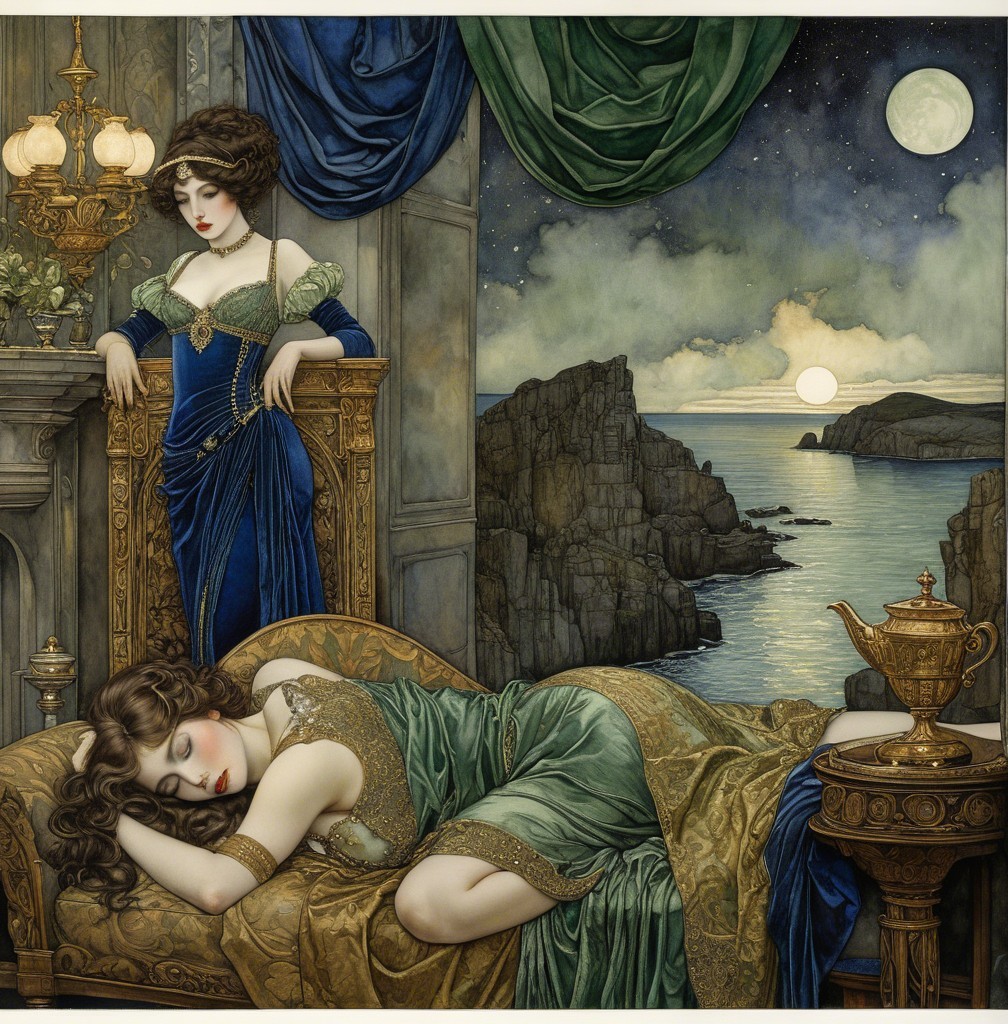 The image features two elegant women in rich, historical attire. One stands thoughtfully by a window, while the other reclines on a couch, surrounded by a dreamy, moonlit landscape.