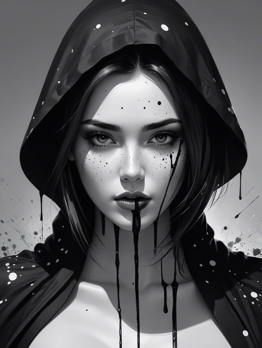+ Prompt:Only splashes red. White dotted black half covered by a V tied hidden gem cloak, fair skin beautiful brunette woman, very pretty, black and white Speedpaint with large brush strokes and paint splatter by Junji Ito, Robert Oxley, Ismail Inceoglu, Kaluta, richard anderson, paint splatter, a masterpiece, 8k resolution, trending on artstation, horror, terrifying, highly detailed intricate