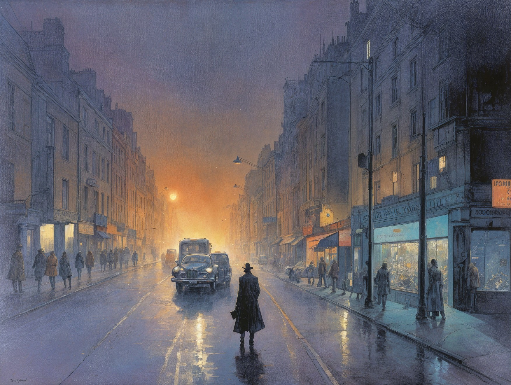A lone figure stands on a rain-soaked street, gazing at a vibrant sunset. Shadows of people and vintage cars create a nostalgic atmosphere, while glowing shop windows add warmth to the scene.