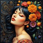 A serene portrait of a woman adorned with vibrant flowers in her dark hair, set against a textured backdrop. Her soft expression and warm color palette evoke a sense of beauty and tranquility.