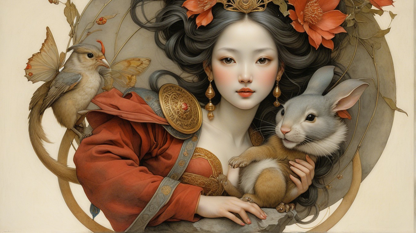 A serene young woman with flowing black hair adorned with flowers holds a small bird. She's dressed in elegant, colorful attire against a softly illuminated, circular backdrop.