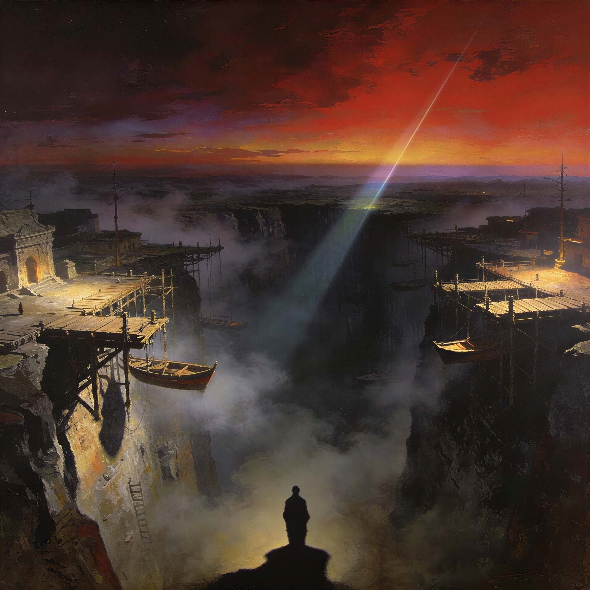 A striking painting depicts a deep, misty chasm under a fiery red-orange sky at sunset. In the foreground, a silhouetted figure stands on a cliff edge, gazing into the abyss. On either side of the chasm, wooden platforms and makeshift docks extend precariously from the cliff faces