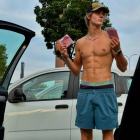 A fit young man with a muscular physique stands by a parked white car. He is wearing blue athletic shorts and raises one finger, possibly indicating a point or idea. Lush greenery is in the background.