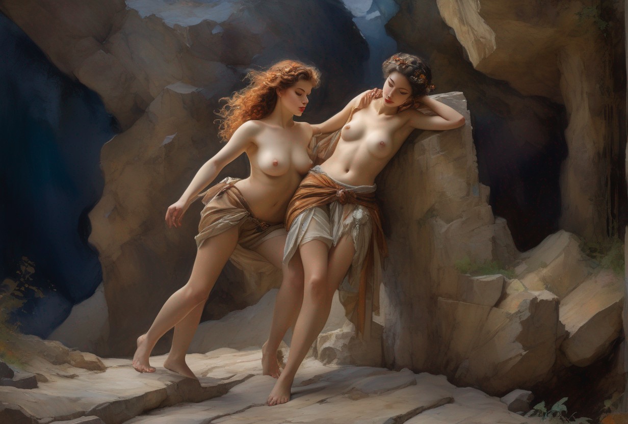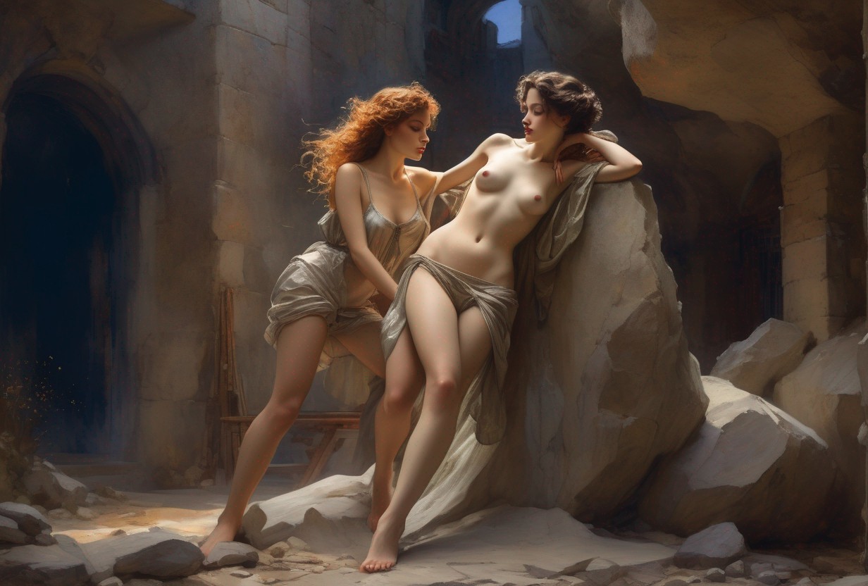 Two individuals in classical attire sit intimately on steps, bathed in warm sunlight filtering through an old European-style corridor.