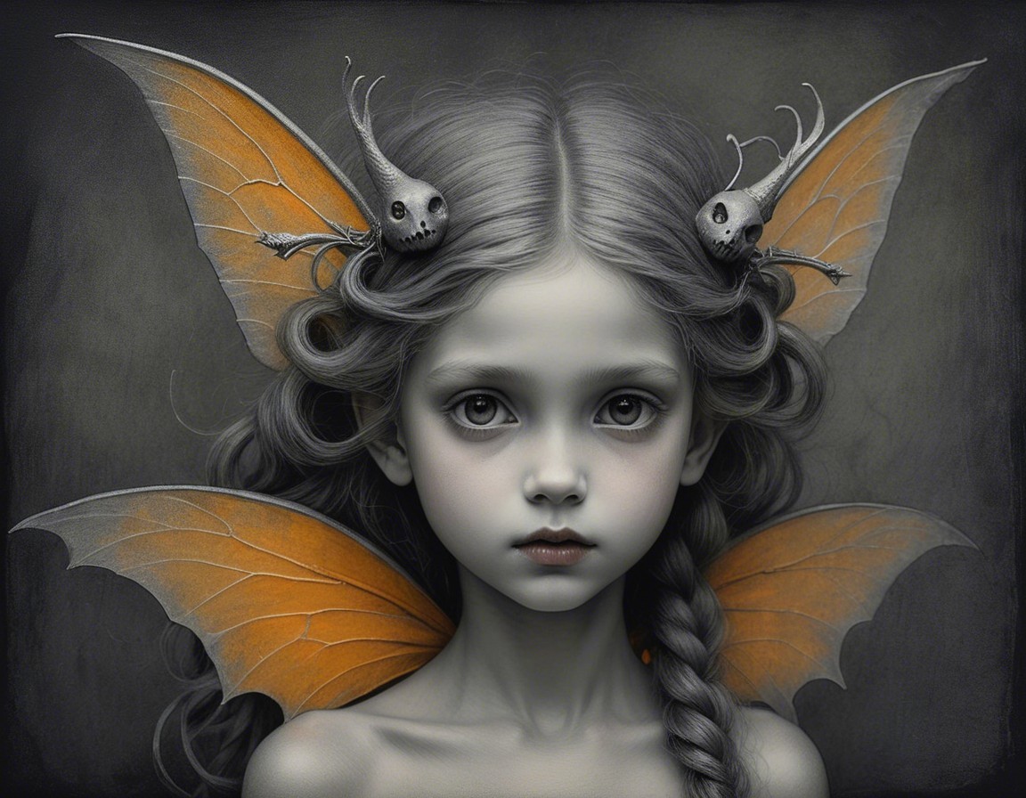 Prompt: A pencil and charcoal sketch of a demonic little Halloween fairy girl, Mucha inspired emotional nature ephemeral sculptures of Andy Goldsworthy, tiny human form, essence captured as if created by surrealist photographer Noel S Osvald rendered in bright ombre colors, mixed with influences by John Bauer and Tim Burton, faded dark grey background, minimalistic art, with details that reflect advanced rendering techniques that push the drawing's realism even further