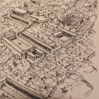 A watercolor painting of an ancient Greek city, with orange and blue roofs, with black pen-outlined buildings and houses covering the side of a mountain, with a stadium at the top of the mountain overlooking the city, and a temple with red roof, white pillars, and arches, with tall cypress. Based on a drawing by J. Knothe in a book "Art of Building". 01.2026