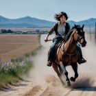 A young woman rides a galloping horse through golden fields, her long hair flowing in the wind. The scene captures a sense of freedom and adventure under a dramatic sky.