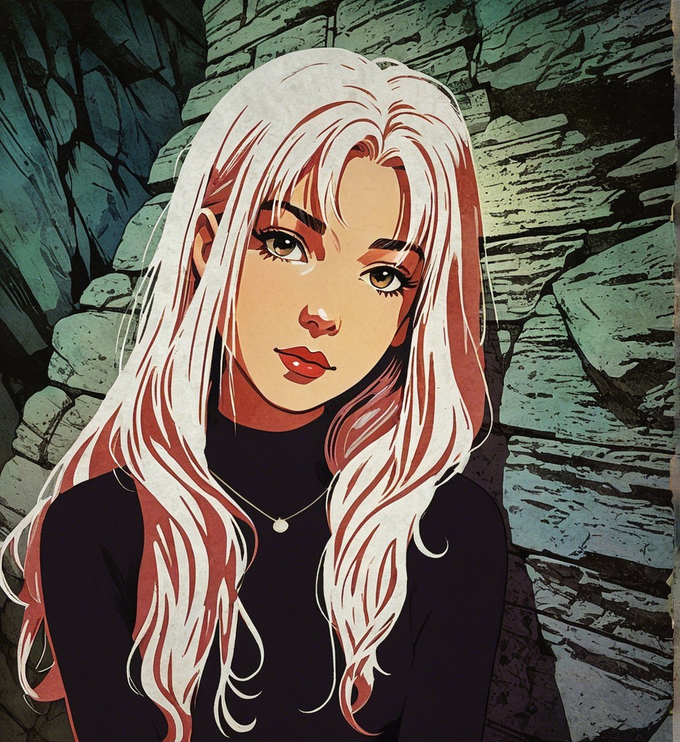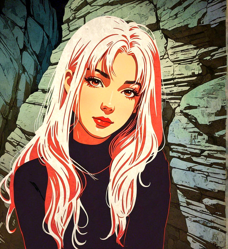 Prompt: Simplistic portraiture, stylized lineage illustration 1.5, Stylized woodblock print, red outlined chrystalline hairstyle, blotting paint, overspray of watercolor paint, stylized Comic book art merged with pulp art and storybook illustration, Handsome teenage temptress in a stone cave, intricate stone textured walls, 3 point lighting, luminous plasticity1.3, luminism, cel-shaded, sculpted, rim lighting, divisionism, maximalism, biolumiscent, devilish eyes, wispy texture of fine lines, overspray of paint ,1970s adult comic art style, high detail, soft-focus, reminiscent of erotic art, octane render, muscular, eroticism, dreamscape, color glitch, desaturated colors, warm tones, movie poster art, plasticity 1.1, luminosity 1.3, brightness 1.4, stylized line-art fusion, facial and bioluminescent elements, squiggly line art, extremely intricate fine lines, beautiful composition by Rosina Wachtmeister and William Bradley, tetradic color scheme black beige pink ochre, extremely detailed fantasy elements, dynamic lighting accentuating beauty and attraction, abstract neuronal filigree touches, Iris van Herpen's Hypnosis collection influence, retrofuturistic details, 3 layers of dof, simplified plasticity, hybrid fabrics, dethereal, triadic color scheme beige red blue, textured skin by William Bradley, Novelty architecture, sawtooth wave, enlighted atmosphere, dynamic lighting 1.7, parallax occlusion 1.5, 32k ultra hd,, science fiction artwork, light black hair, implants, beret with fabric textures, cervical collar shackle, leather, colorful, saturated colors, sci-fi, mystic, optical illusion, fractal, intricate, reminiscent of FrankMcCarthy and stan lee and Robert henri