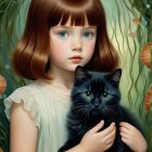 A young girl with striking eyes and colorful hair holds a sleek black cat, surrounded by a vibrant backdrop of flowers and greenery, creating a whimsical and enchanting atmosphere.