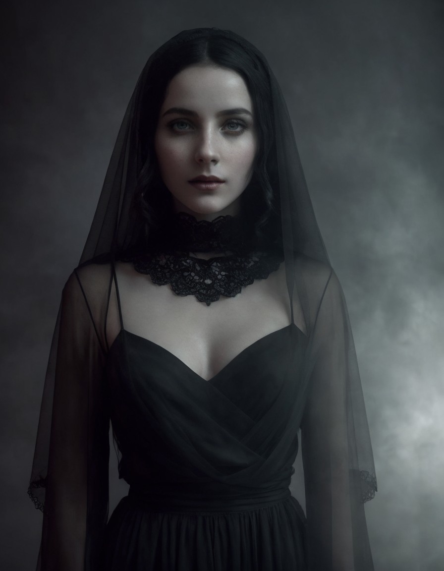 A woman in a black dress with a lace collar and veil stands amidst a misty backdrop, exuding a mysterious and somber aura.