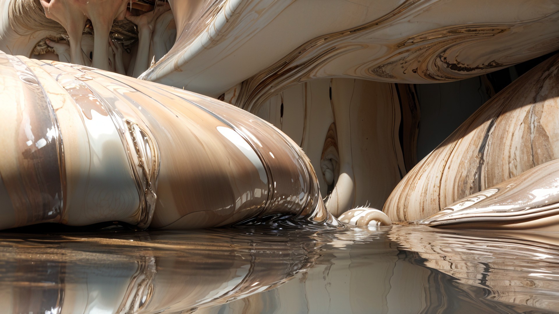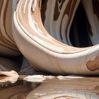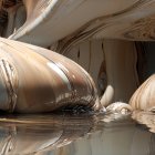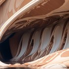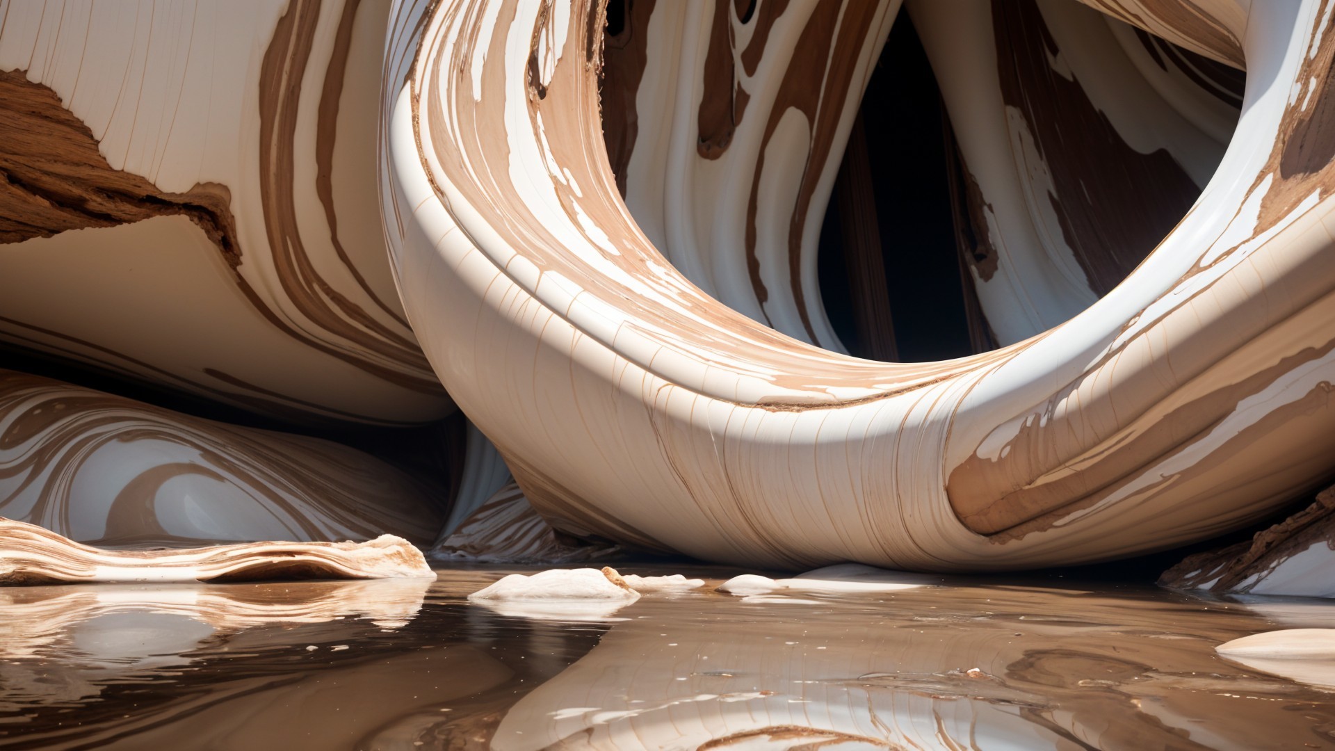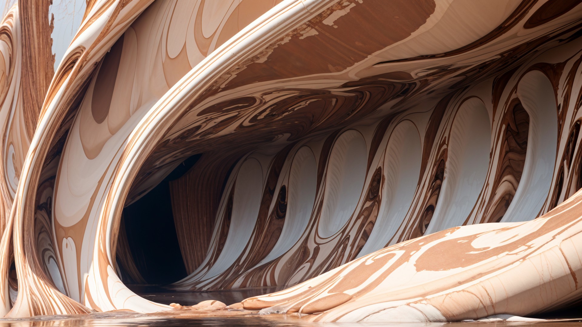 The image features a mesmerizing abstract cave-like formation with flowing, wavy patterns in tones of beige and cream, illuminated by soft, diffused light, creating a serene and ethereal atmosphere.
