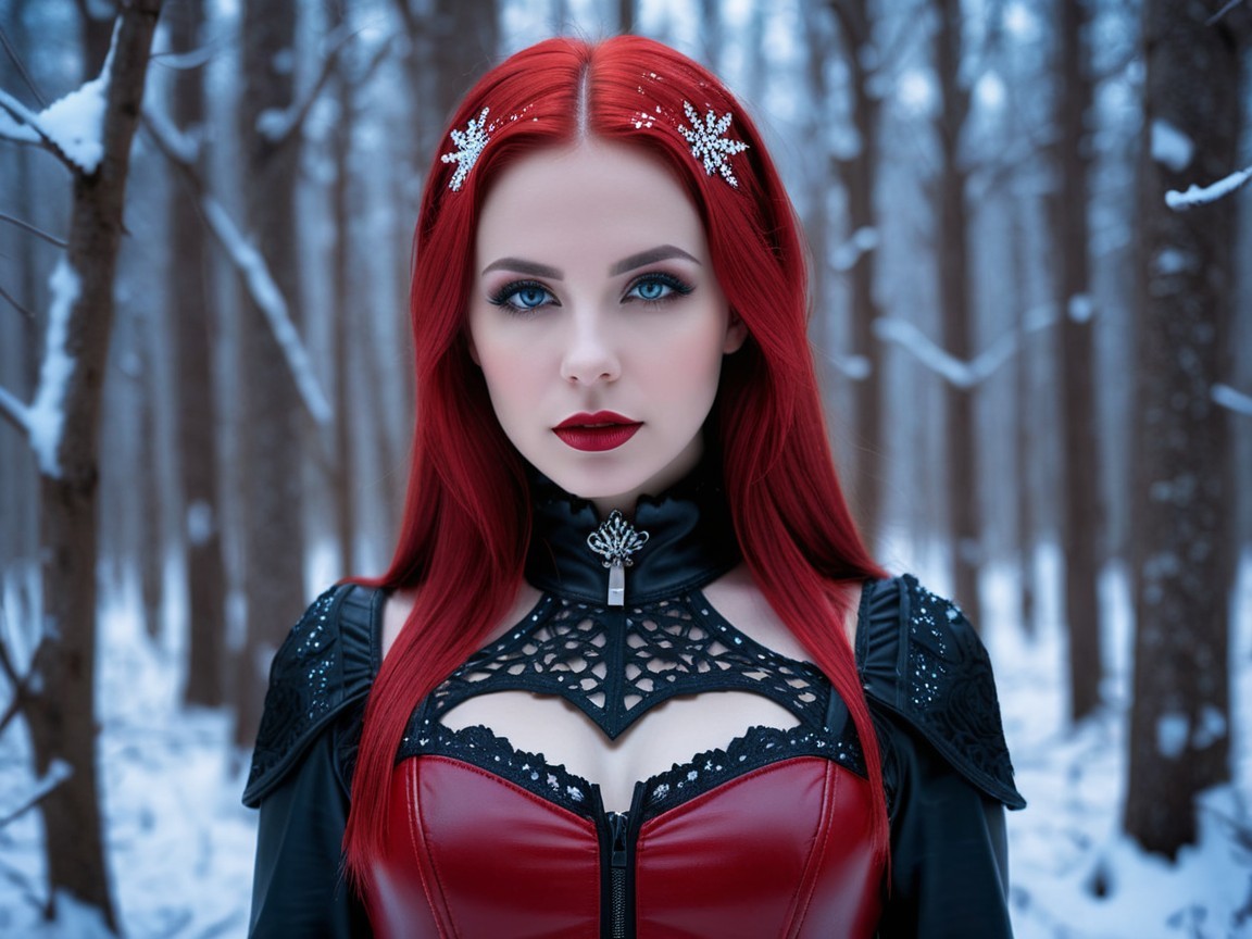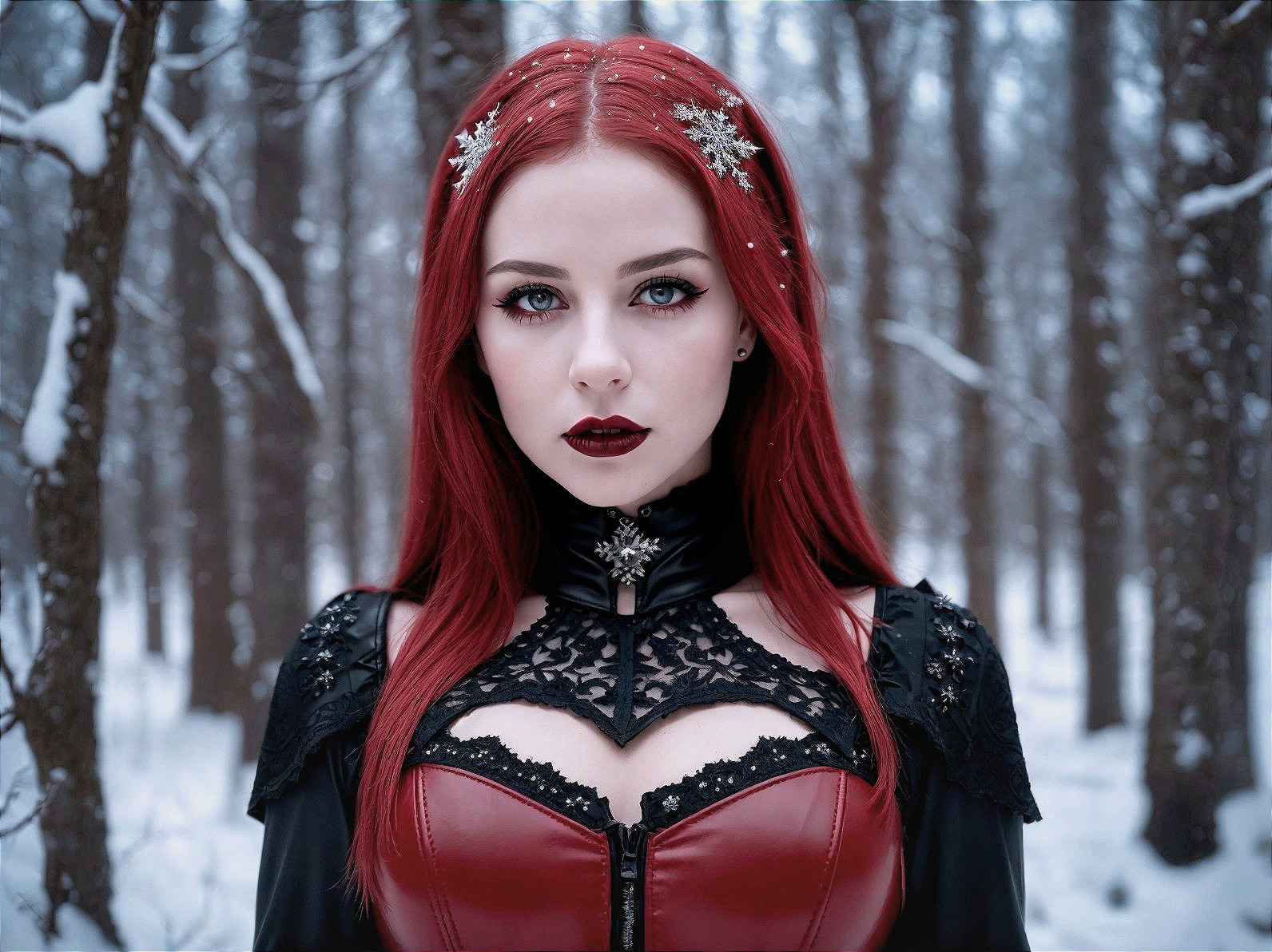 A striking woman with long red hair stands in a snowy forest. Her outfit features dark lace and a bold, red corset. Snowflakes gently fall around her, enhancing the mysterious atmosphere.