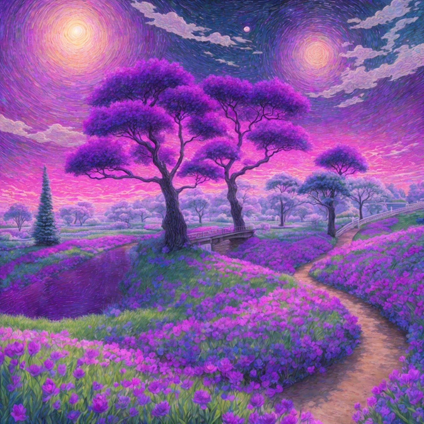 A vibrant landscape features lush purple flowers under a swirling sky with two suns. Twisted trees and a serene bridge create a magical, dreamlike atmosphere. A winding path invites exploration.