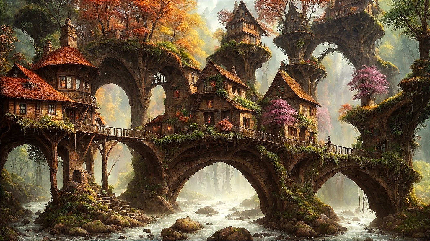 A fantasy forest scene with treehouses connected by a stone bridge over a river, amid blossoming trees and fog.