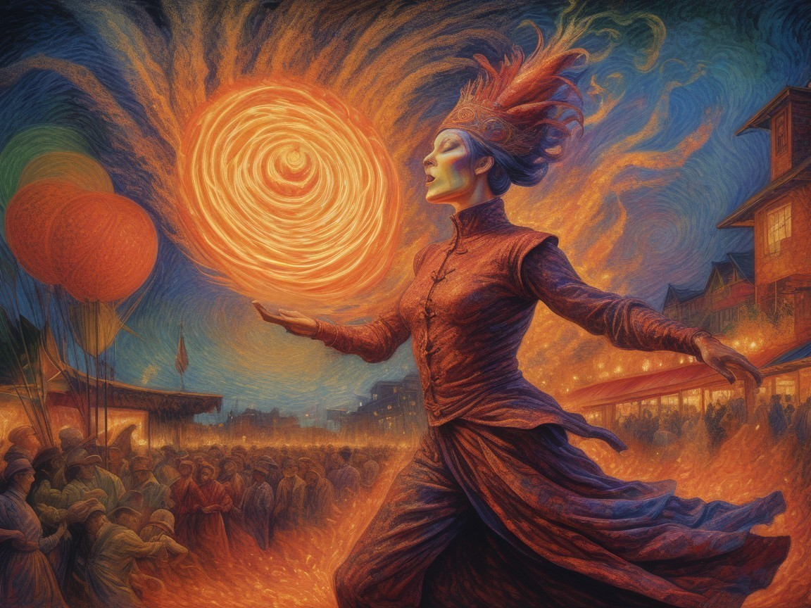 Prompt: "The carnival fire-eater; motion, dynamic movement, a metaphysical painting; layered artwork in the style of Umberto Boccioni and N.C.Wyeth, and by Virgil Finlay, softened with Sarah Moon and Mori Sosen"