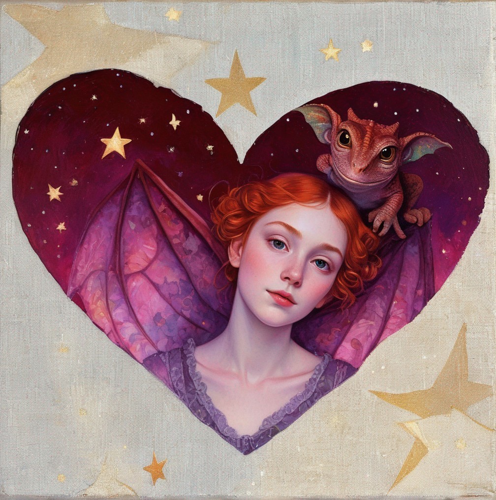 mail art, double exposure, cuteness overload, Northern Renaissance, tempera on old worn canvas, fairytale, symbolism, dynamic poster, ginger-haired girl with a big gracious demon chameleon gargoyle unhuman creature on her shoulder, dreamy night sky, complex background, detailed scales, tempera portrait, night, stars, detailed jungle landscape, dynamic pose, deep colours, sharp eyes, glowing aura, by Jan van Eyck, Hieronymus Bosch, Albrecht Dürer, Nicoletta Ceccoli, patchwork, mosaic, storybook illustration, intricate unusual beautiful details, ultra-detailed, dynamic pose, tiny details, masterpiece, high quality, volumetric lighting, luminism