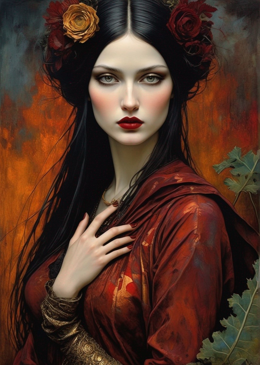 She's as beautiful as death, as seductive as sin, and as cold as virtue. Magical enchantress. colors kale, gold, rust, burgundy, black.