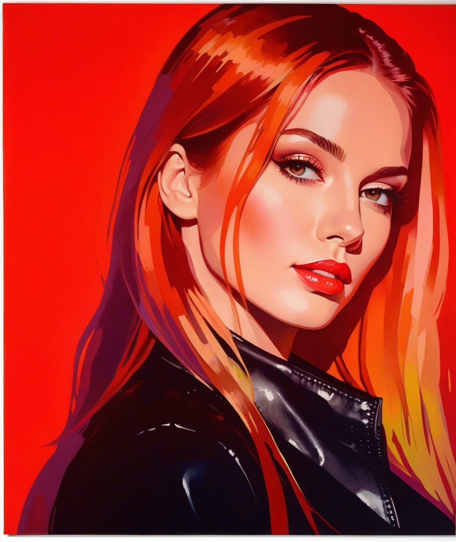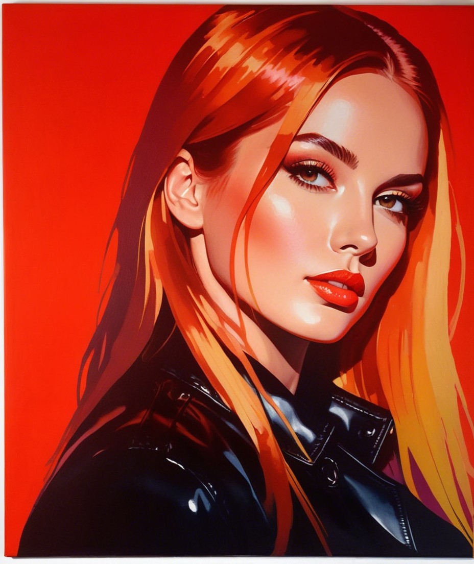 A striking portrait of a woman with vibrant orange hair and bold red lips. She wears a black leather jacket, set against a vivid red background that enhances her confident expression.