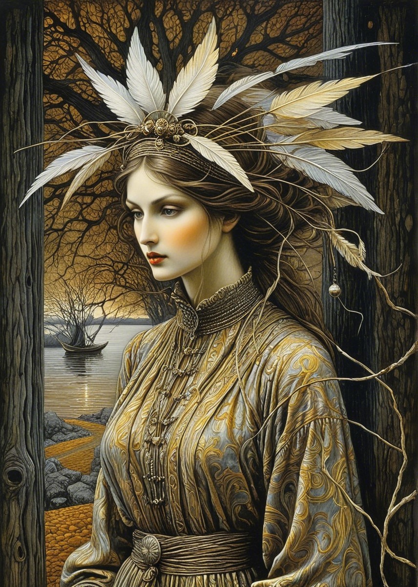 A serene woman with flowing hair stands before an ornate window, wearing a delicate dress. Her thoughtful expression and gentle pose evoke a sense of tranquility and introspection in a mystical setting.