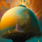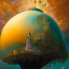 The image features a surreal landscape with a large, domed structure in vibrant hues of orange and green. Ethereal figures and butterflies hover amidst flowing patterns and dreamlike scenery.