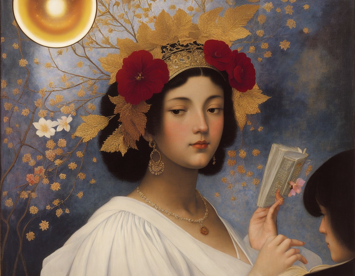 A classical painting depicts a woman with a halo, reading a book, against a blue sky with a golden sun.