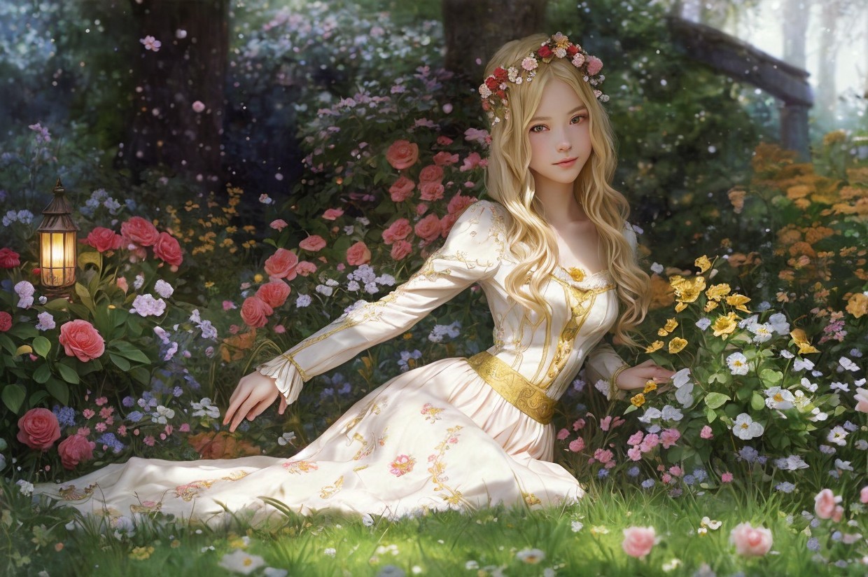 Two young women sit amidst a vibrant garden filled with blooming flowers, dressed in elegant, colorful dresses. Soft sunlight filters through the foliage, creating a serene, enchanting atmosphere.