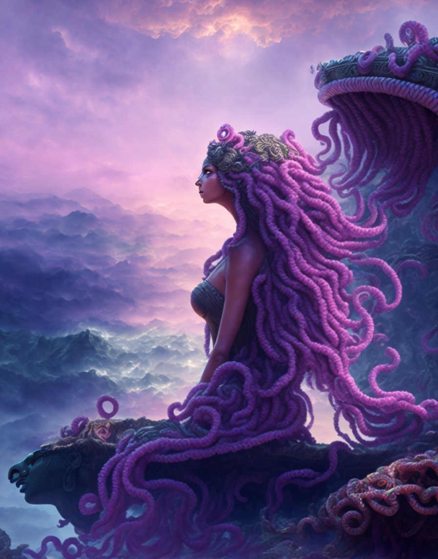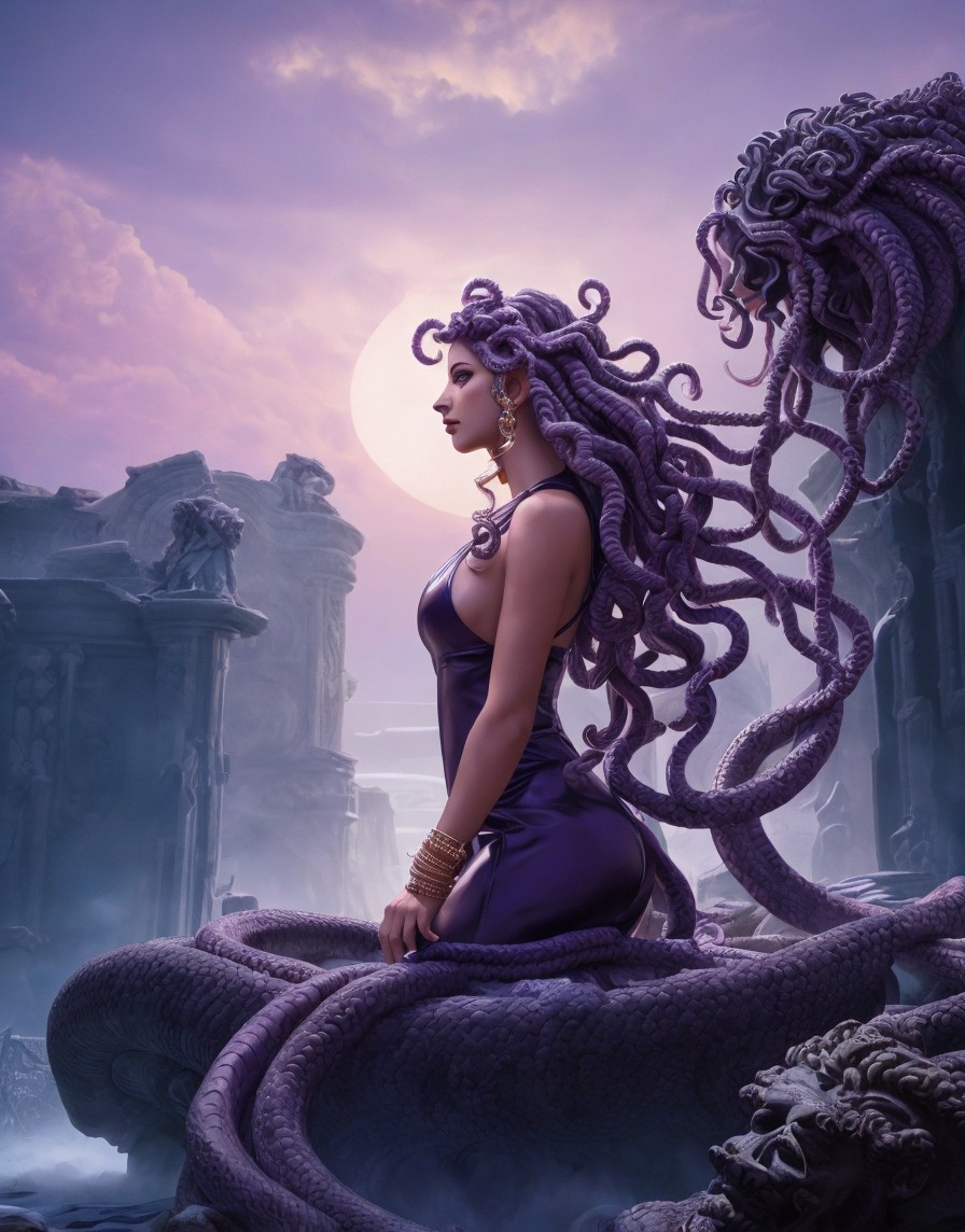 Serpent-Haired Figure in Misty Twilight Cityscape